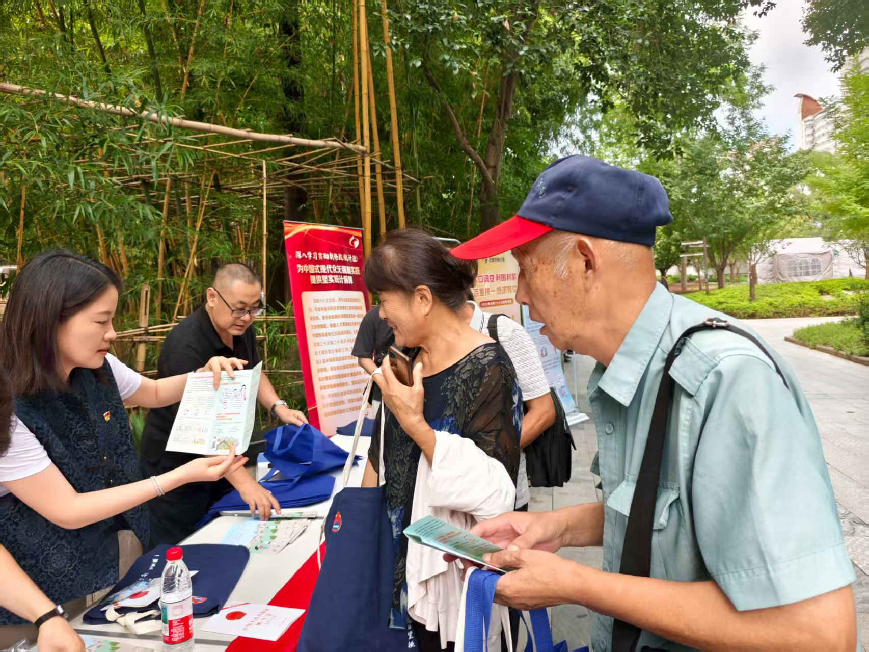随后转场至城中公园广场开展便民服务,以务实举措架起沟通桥梁。现场设置4张展板、2个专项服务台,工作人员发放相关宣传资料,业务骨干围绕全国1%人口抽样调查流程、数据采集规范及新修改统计法等内容细致答疑解惑,用通俗语言破解专业壁垒,展现统计人专业务实的精神风貌。