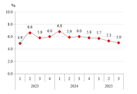 根据地区生产总值统一核算结果,前三季度全市实现地区生产总值11885.74亿元,按不变价格计算,同比增长5.0%。其中,第一产业增加值93.90亿元,同比增长2.5%;第二产业增加值5497.17亿元,增长4.9%;第三产业增加值6294.67 亿元,增长5.1%。